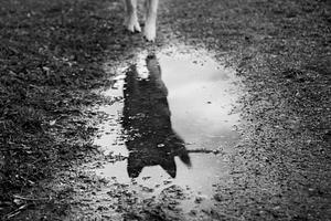 Black and white photograph of a good dog reflected in a puddle